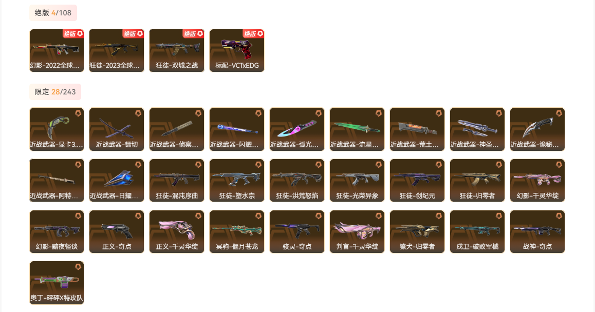 wegame无畏契约★刀皮数量11 枪皮数量139 限定32 究极3,幻影-2022全球冠军赛、狂徒-2023全球冠军赛、狂徒-双城之战,近战武器-弧光异彩军刀、近战武器-侦察力量蝴蝶刀、近战武器-流星兵团短剑、近战武器-闪耀之星荧光棒、近战武器-显卡3.0爪刀、近战武器-荒土机兵热能刀、狂徒-紫阙金琅、狂徒-2023全球冠军赛、狂徒-归零者、狂徒-塑水宗、狂徒-弧光异彩、狂徒-堕天遗武、狂徒-洪荒怒焰、狂徒-艾沃莉的梦之翼、狂徒-混沌序曲、狂徒-双城之战、狂徒-创纪元